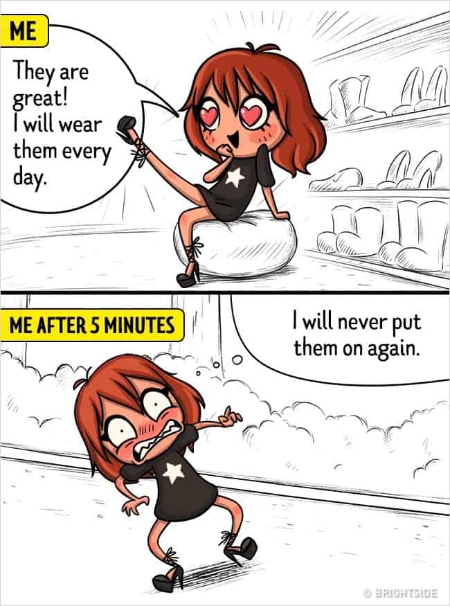A fantastic photo made for the soo complicated girls. In a given picture, the girl bought high heels for her, and she loved them so much. She decides to wear them daily because they are too pretty. After five minutes when she goes out wearing heels, she was in so much pain because high heels are so uncomfortable and hurting. She decides never to put them again.