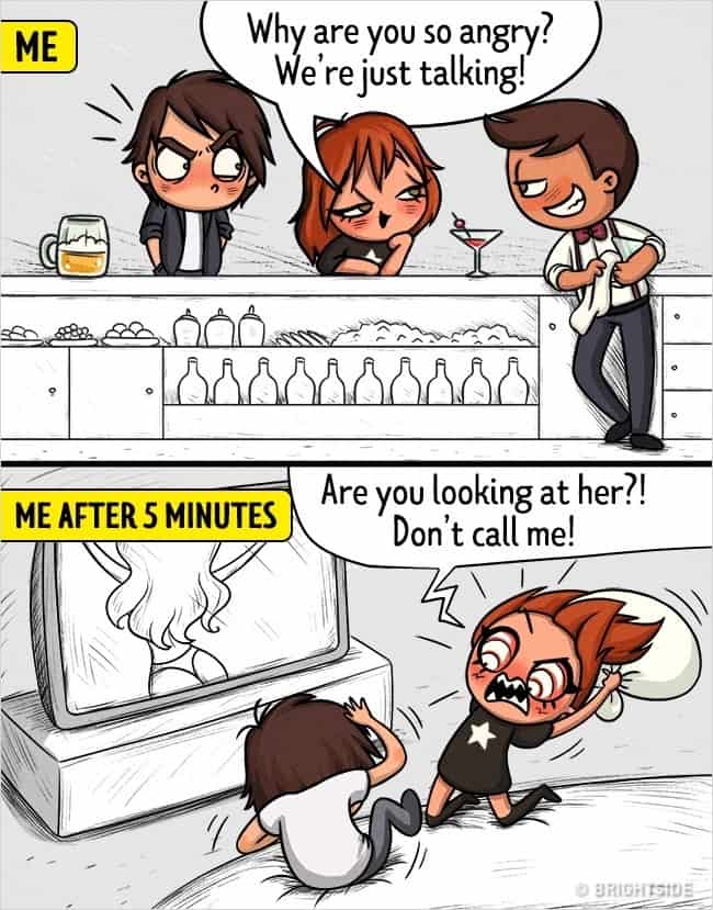 In the given photograph, the girl is talking to a guy, and her boyfriend does not like it. The girl said to her boyfriend, “ we’re just talking! Why are you so angry? After five minutes, her boyfriend is watching a nude girl on television, and she is getting mad at him.