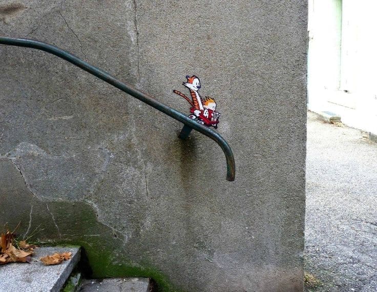 In the picture, we see that Calvin and Hobbes are riding their bike down the staircase, But one should let them know that staircase is just about to have the tragic end and they should carefully move for the next step.