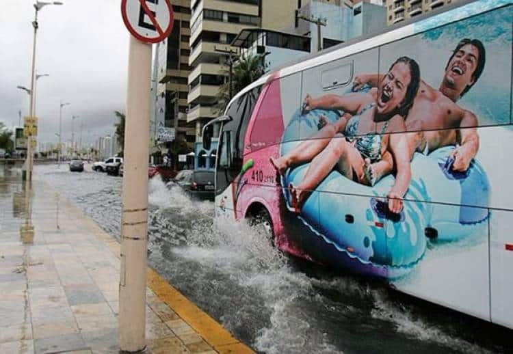 Flooded roads are made for buses with water park advertisements on them it seems. This bus made the best splash of flood water that looks like an extension of the splashes in the water park advertisement on the bus side. It seems as if the couple is waterboarding into the street and enjoying it. Amazing isn’t it?
