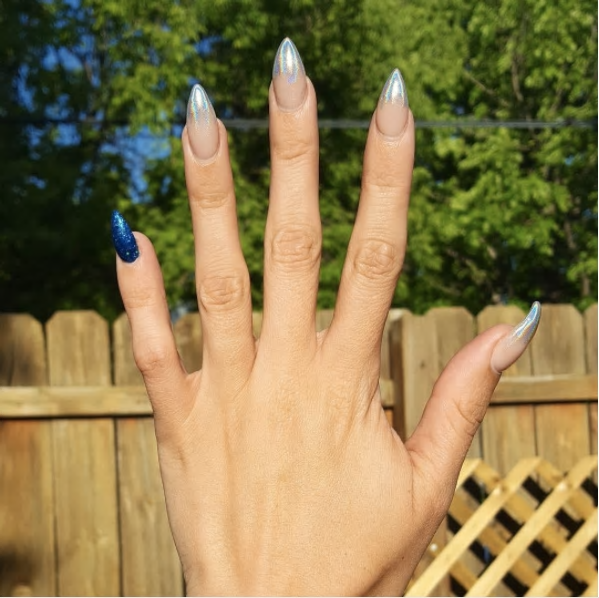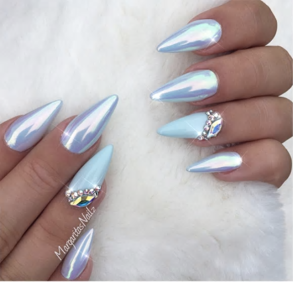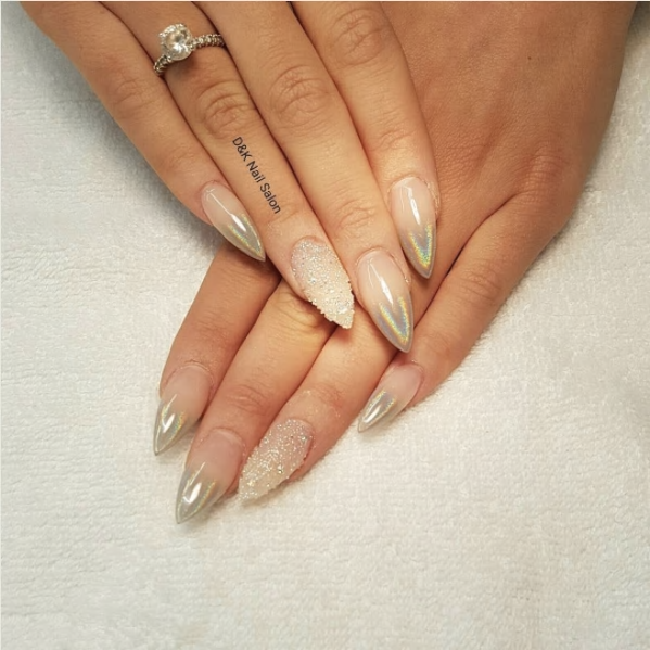 This ombre unicorn nail fades from white to the silver chrome with a beaded accent nail.