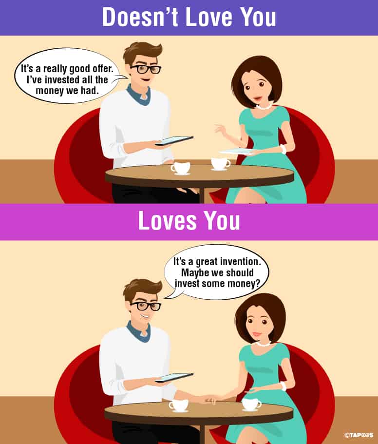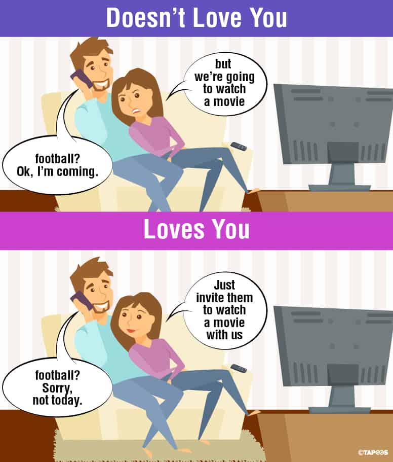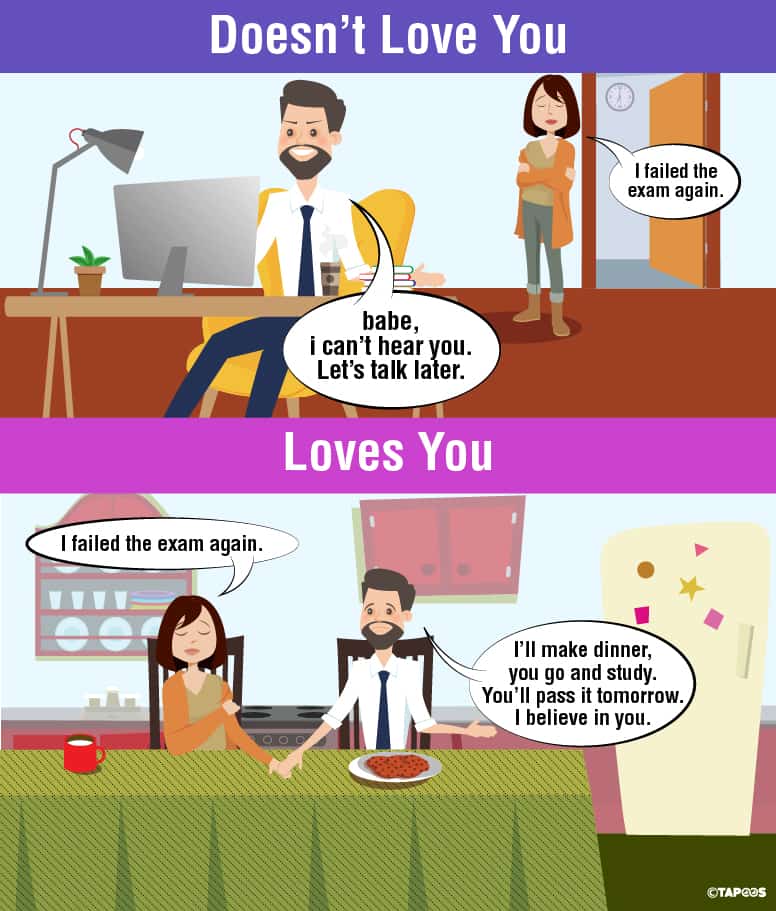Here’s another trick to help you determine whether a guy loves you or not. You come home after a terrible day, and you’re on your period. What does he do? Does he ignore you because of your annoying whining? Does he talk to you and ask what’s wrong, cook you dinner and gives you a relaxing massage? There’s a simple equation to this situation: A man who treats you right in times when you need it the most equals a man who genuinely cares about you and loves you.
