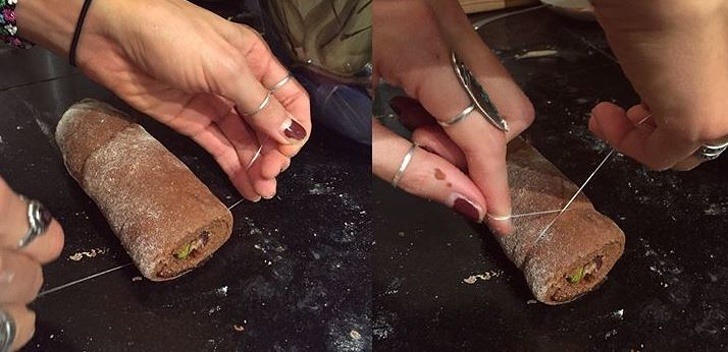We can use dental floss to floss our teeth to protect them from cavities. We can also use floss for other productive purposes. We can use it to cut the cakes and cheeses in the straight line instead of using a knife. We can also tie up herbs and peppers with dental floss.