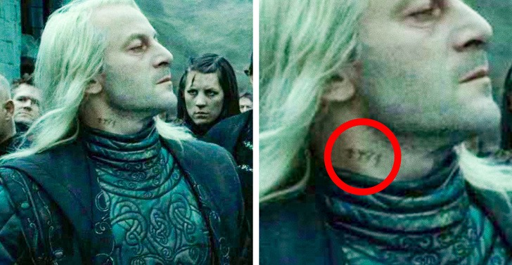 - In the last part of the movie, Harry Potter, you will find one tattoo on the neck of Lucius Malfoy. It was the number that was with him when he got imprisoned in Azkaban.