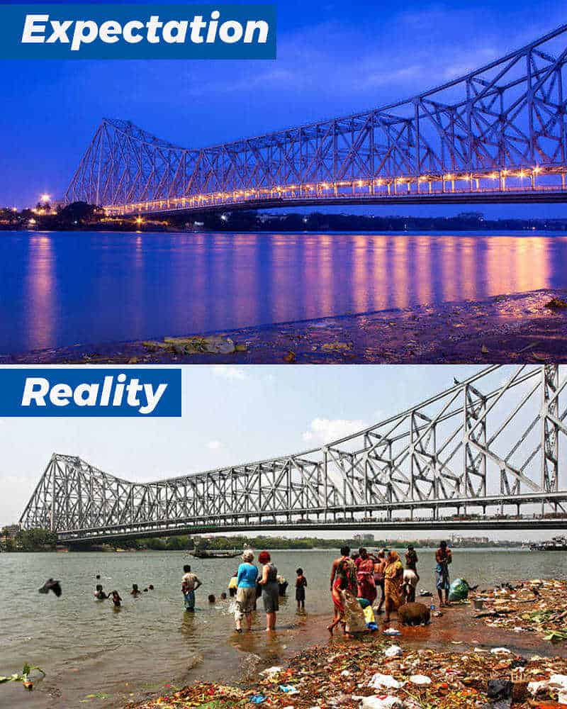 Howrah bridge is on the suspended span over the Hooghly river in West Bengal, Kolkata, India. It was commissioned in 1943. But people bath at the holy place and throw garbage in the river to make it dirty.