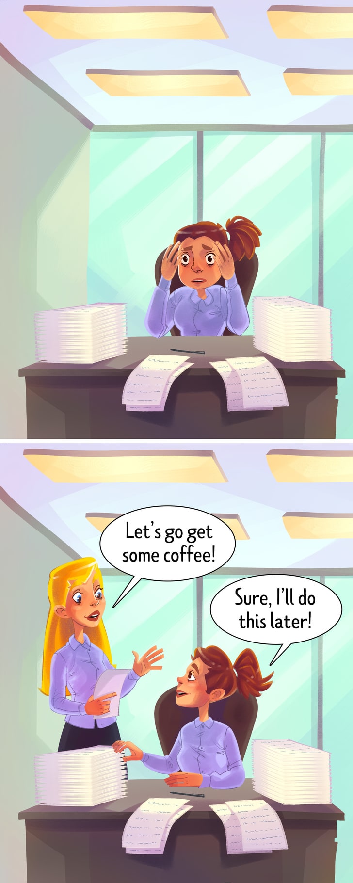 So to show your self-confidence, you should keep your head raised, look up, and keep the back straight. You will feel different in this situation. According to research, the body language of a confident person helps in decreasing their stress level.