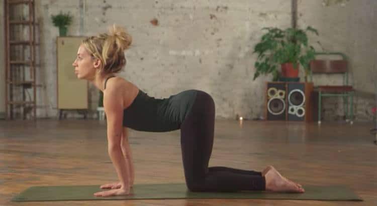 Start this pose by being in the tabletop position with both your knees down on the mat, keeping your neck neutral and loose. Stretch and arch your back while gazing at the ceiling this will help you to relieve back pain.