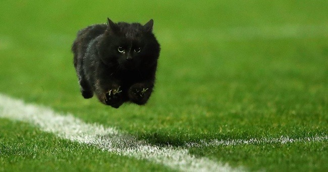 8. WHO WOULD HAVE THOUGHT OF SOMETHING LIKE THIS? THE CAT GOT CAPTURED WHEN IT JUMPED ON THE FIELD DURING A GAME.